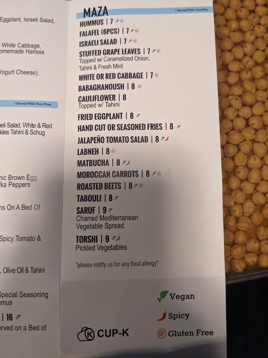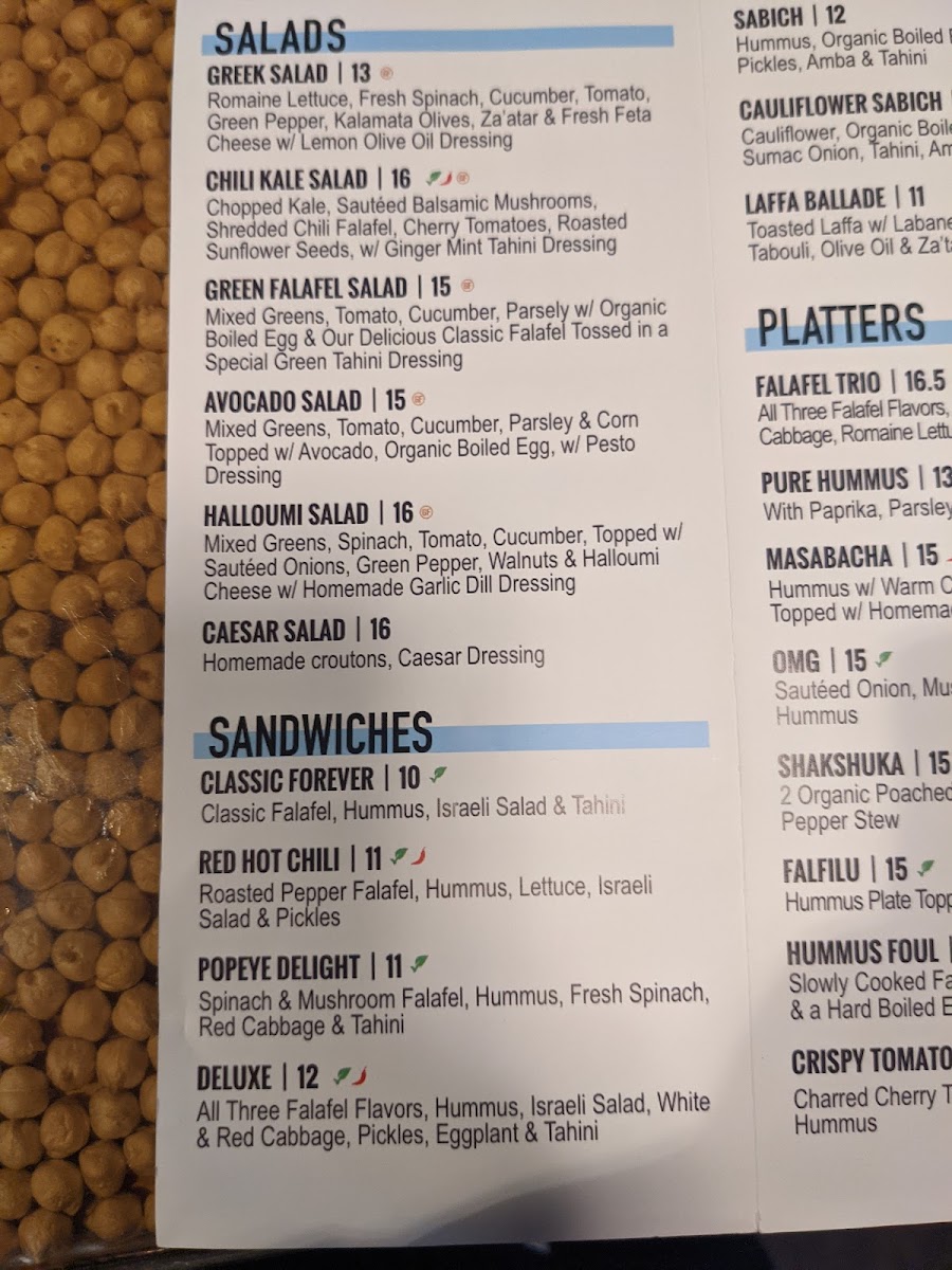 Vegan and spicy. Roasted pepper falafel, hummus, lettuce, Israeli salad, and pickles.